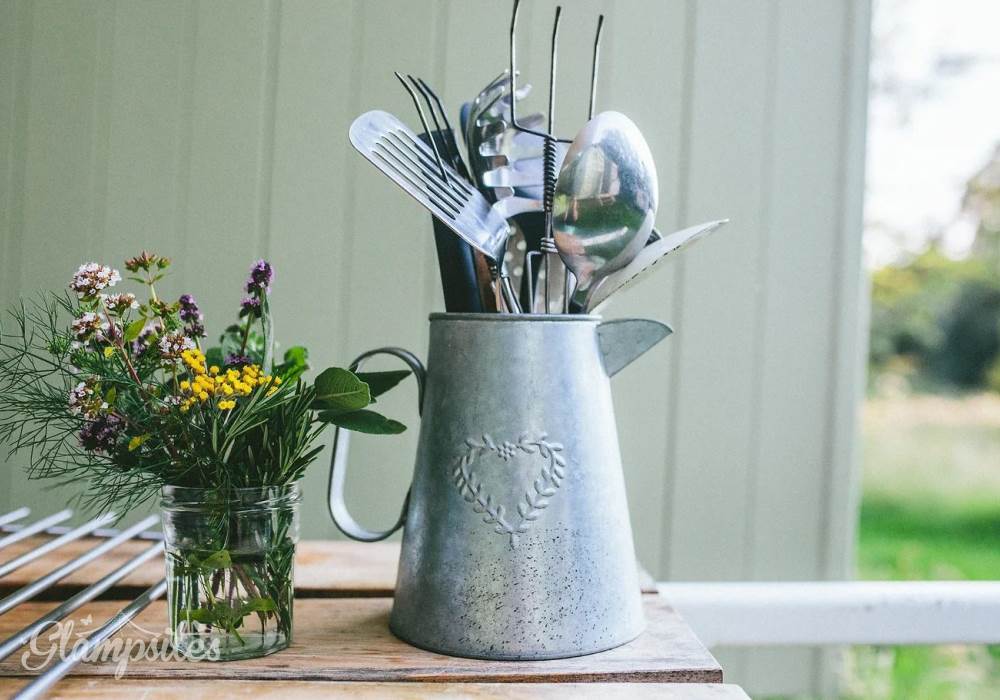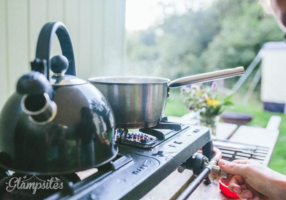 The fully equipped outdoor kitchen is behind the huts, sheltered under a cover in case of rain & overlooking the stream. There's a big gas BBQ, a single gas ring & a sink for washing up. Everything you'll need is provided here - crockery, cutlery and utensils, tea towels & washing up cloths too. There's a cool box for keeping things handy & access to your own fridge & freezer up by the holiday barn for fresh ice blocks & keeping anything that needs it properly chilled.