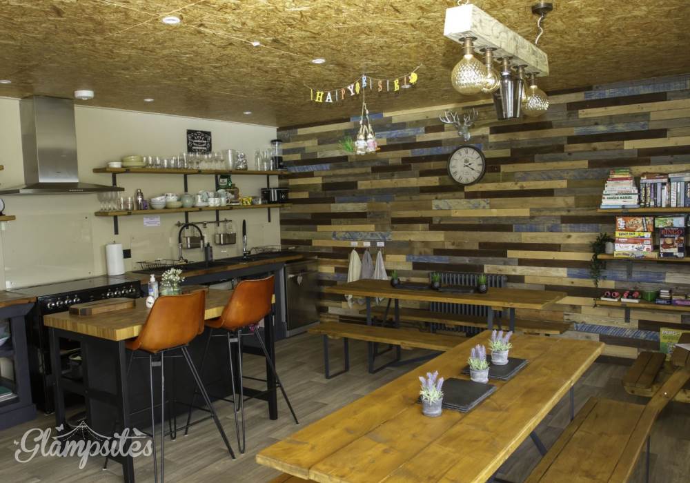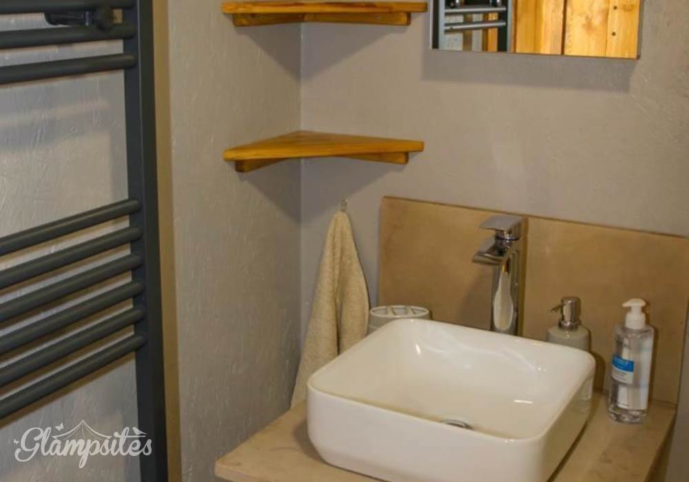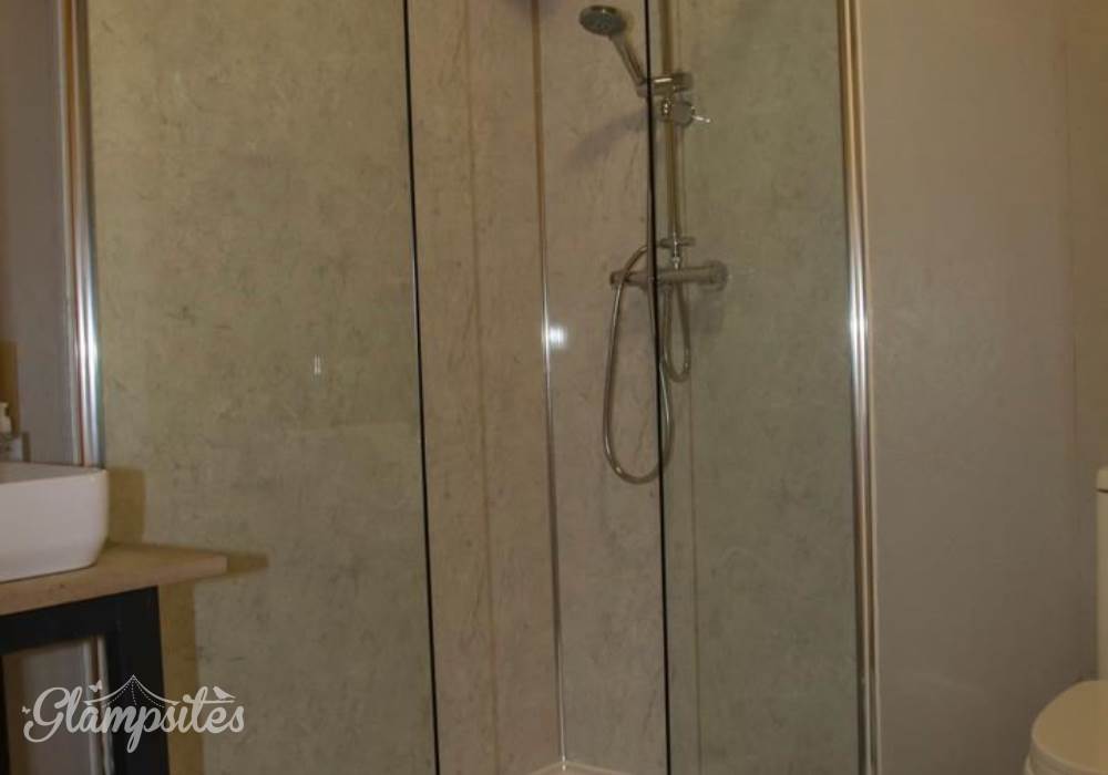 Just a few second's walk away is the kitchen and bathroom block. You will have a private bathroom solely for your use, here you will find a double shower with rainfall shower head, wash basin, flushing toilet and heated towel radiator. Toilet roll, hand wash and sanitiser are all ready for your use.