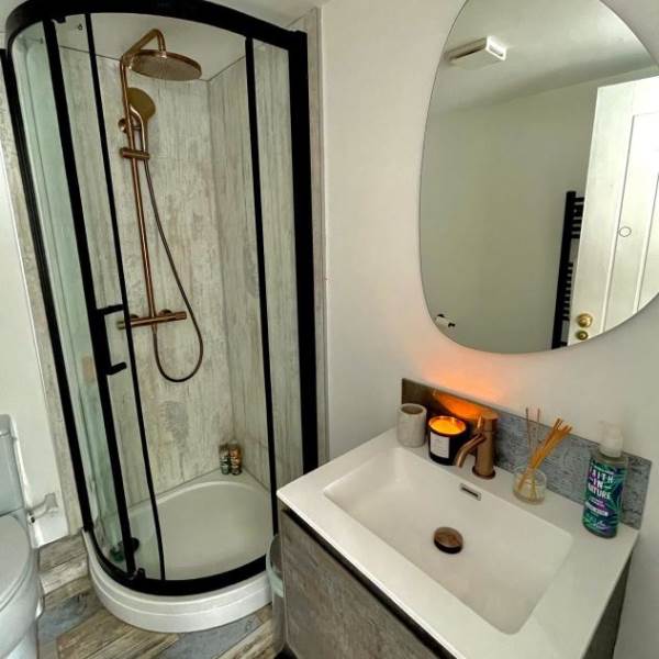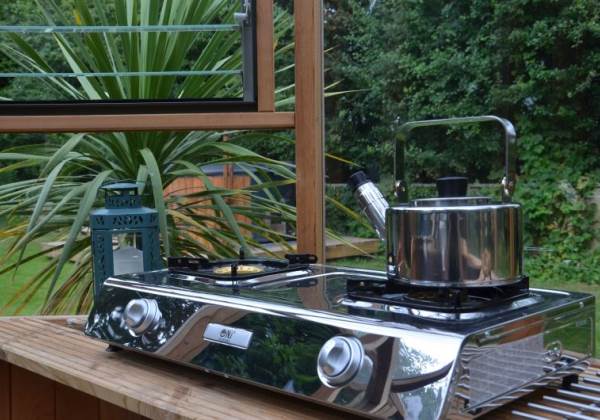This beautifully crafted log cabin with its own hot tub is a perfect retreat for all seasons, 17x12 feet. It is fully insulated and heated. Cosy duvet, crisp linen, towels, table and throws are all provided. Within the cabin there is a fridge, toaster and kettle, and next to the cabin there is a covered kitchen area with a gas BBQ, stove, pizza stone and sink with drinking water. There is free Wi-Fi, books, games and lanterns. You have your own quirky private eco loo right next to the cabin, complete with saucepan sink! This is in addition to the private luxury bathroom, which is a short distance away. Wild Thyme Cabin site is dog secure.