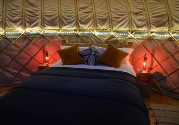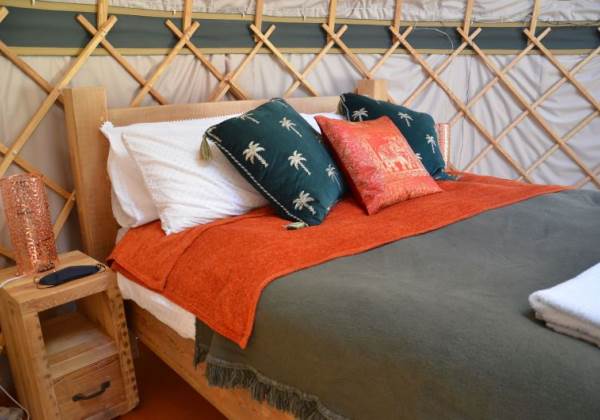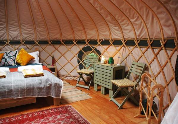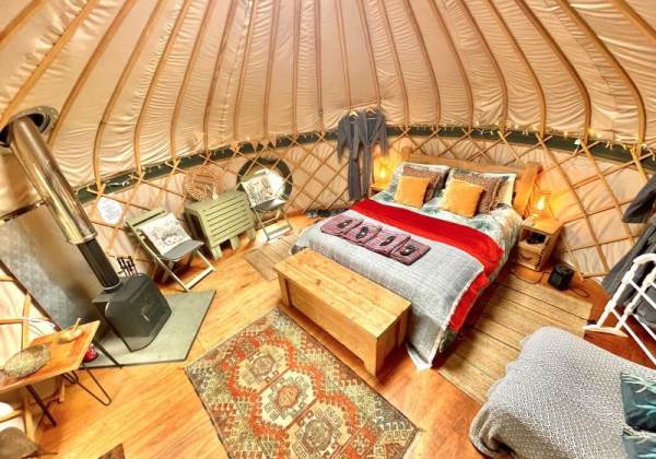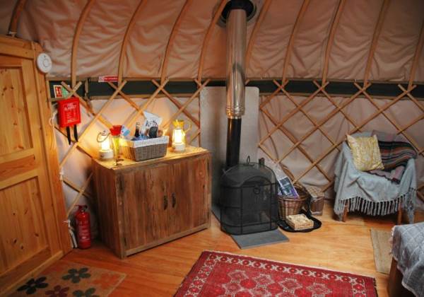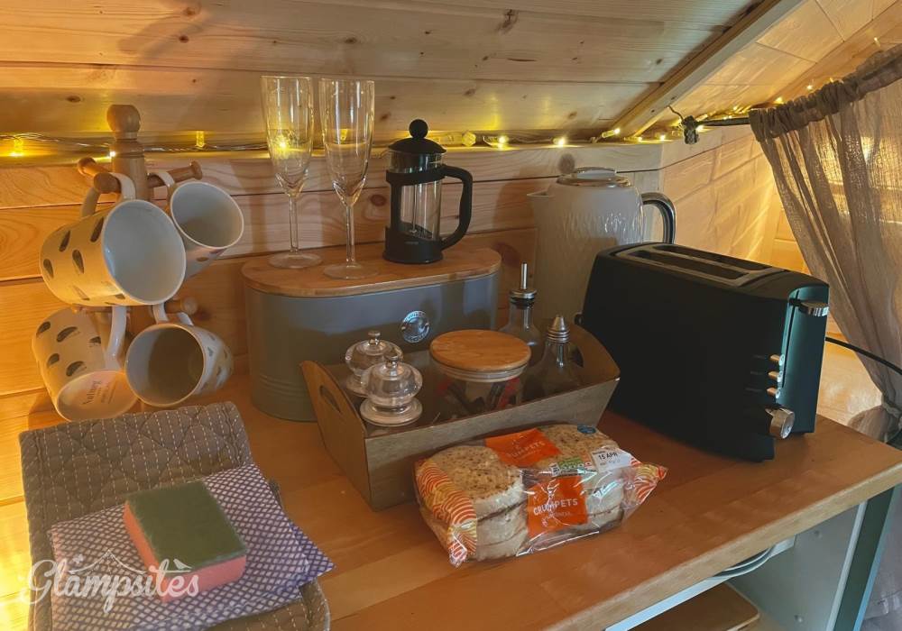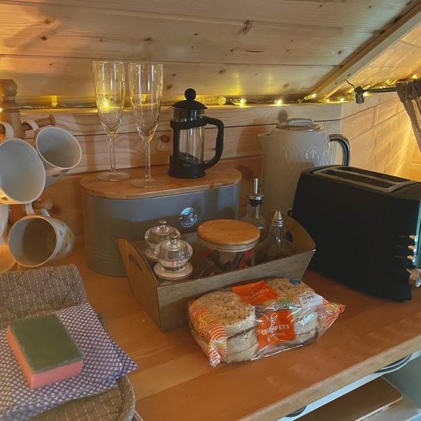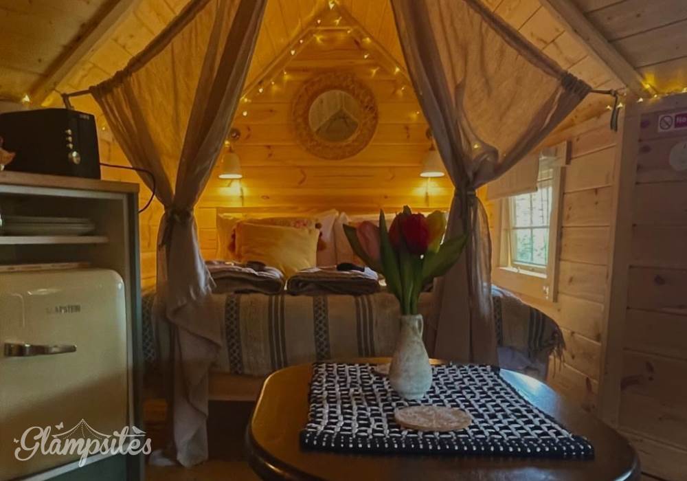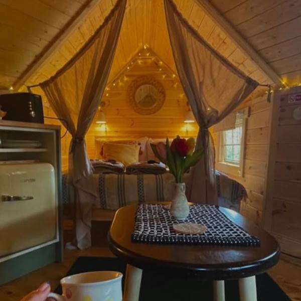 Gorgeous, cosy interior complete with a lovely queen sized bed, bedding, towels, blankets and throws. There is a futon, two comfy chairs and a table in the living area. Fully insulated and heated with a kettle and fridge for that early morning coffee!