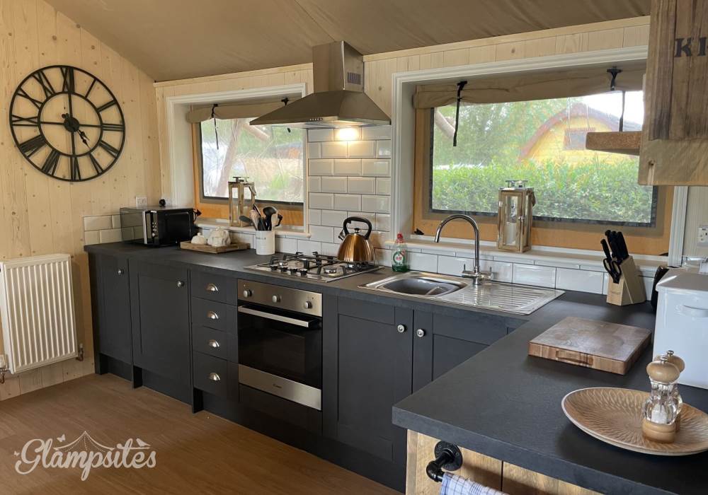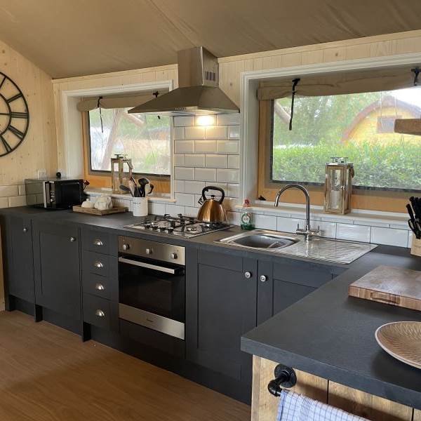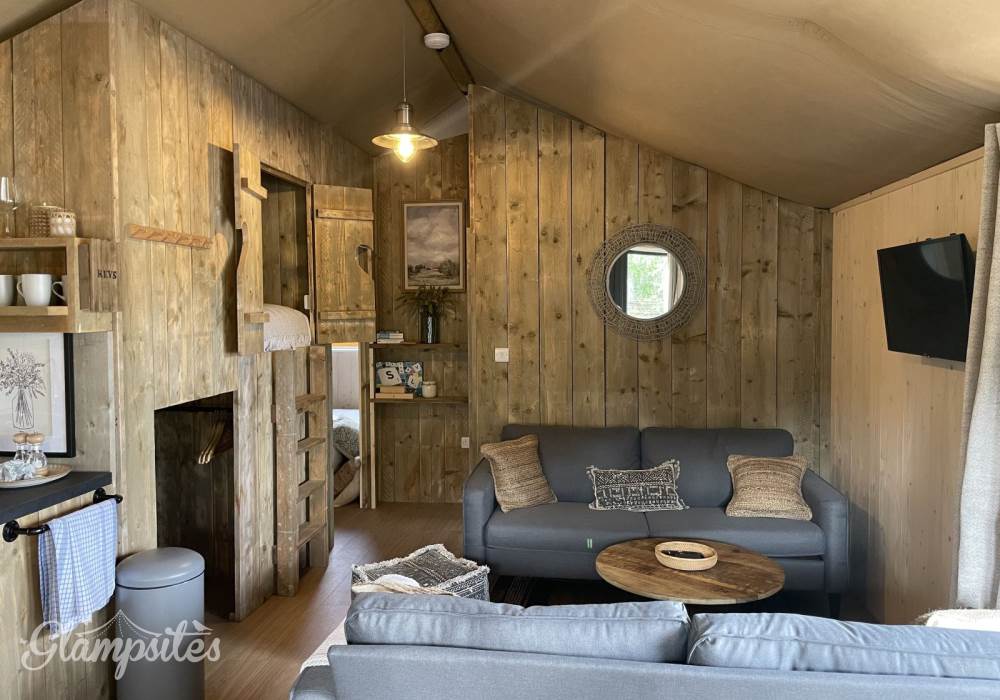 Inside there are two double bedrooms and one cosy “Nest” bedroom perfect for kids and accessed via a small ladder. In addition there is a large, open-plan kitchen and dining area, a cosy living area with a smart-TV, as well as a spacious and modern shower room – it’s hard to remember you’re in a tent!