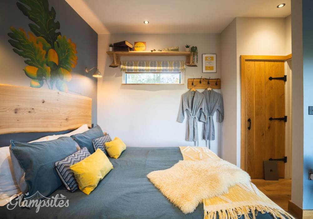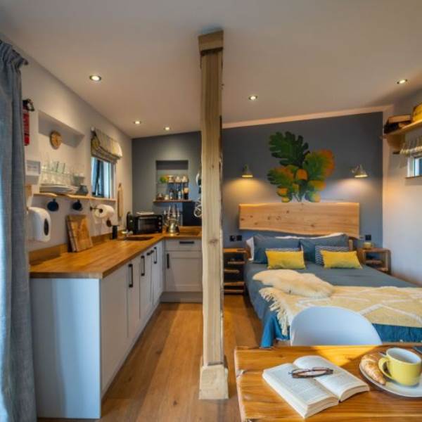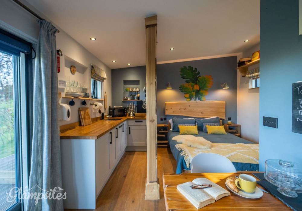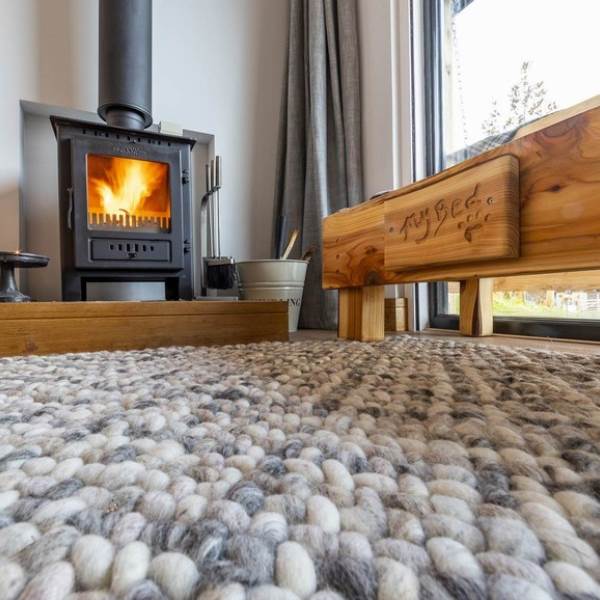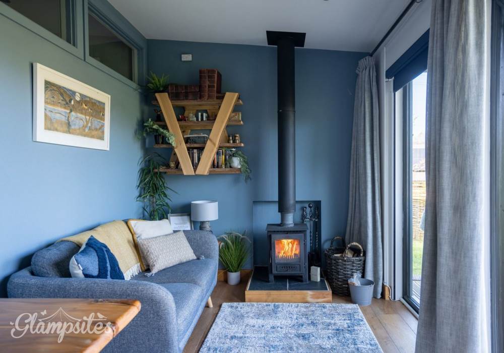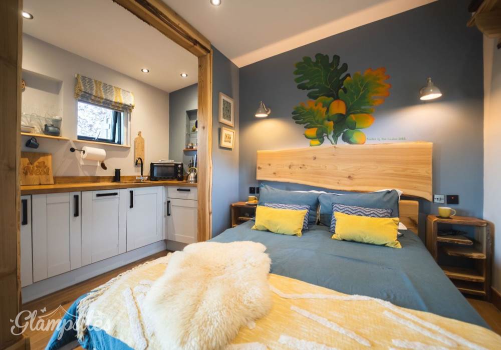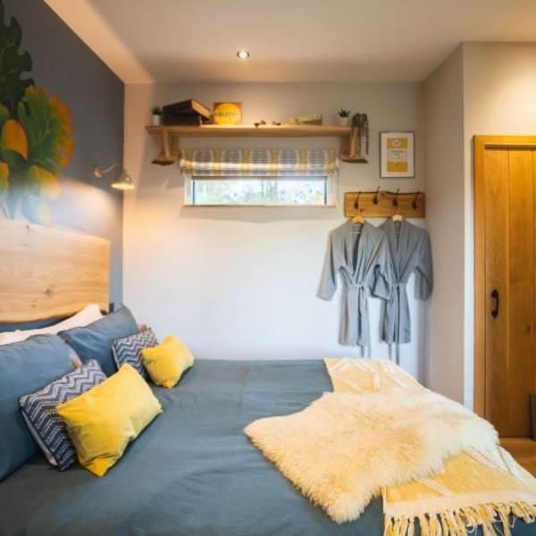 The Nest is a unique, luxury, hand built cedar cabin where everything provided is of the upmost quality and welfare, finished in shades of navy blue & mustard yellow with furniture hand crafted from local cedar.