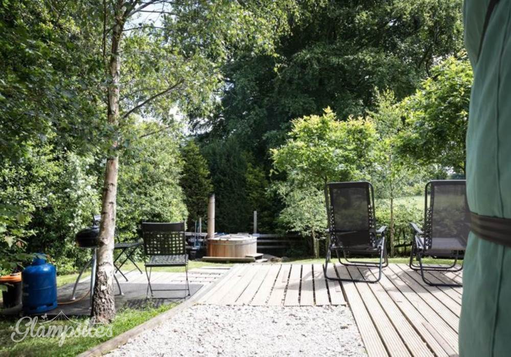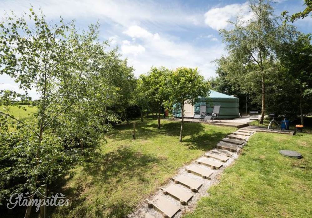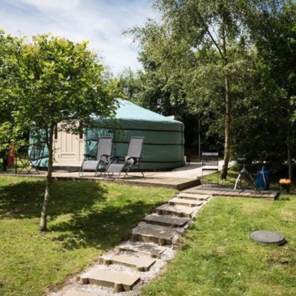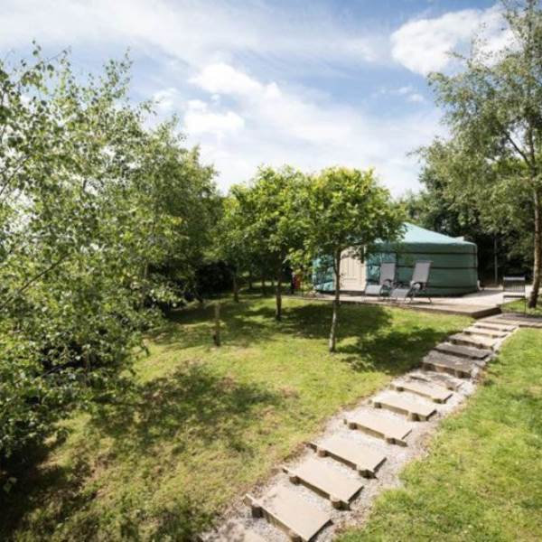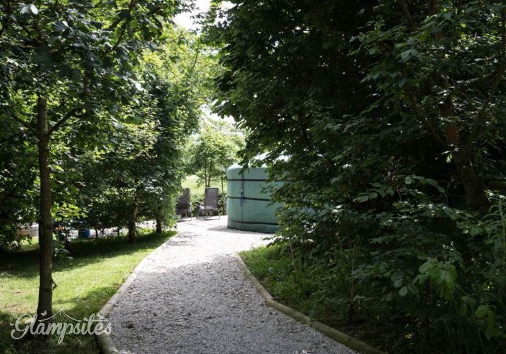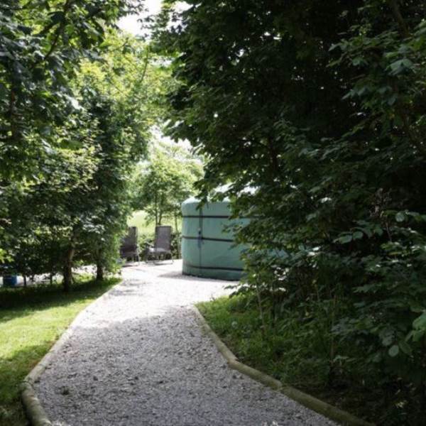 Gaia’s Hideaway is approached from a path at the South-East corner of Upper Hurst Farm Caravan and Camping site leading down to a secluded corner surrounded by trees, natural hedgerows and with open views to the Peak District hills.