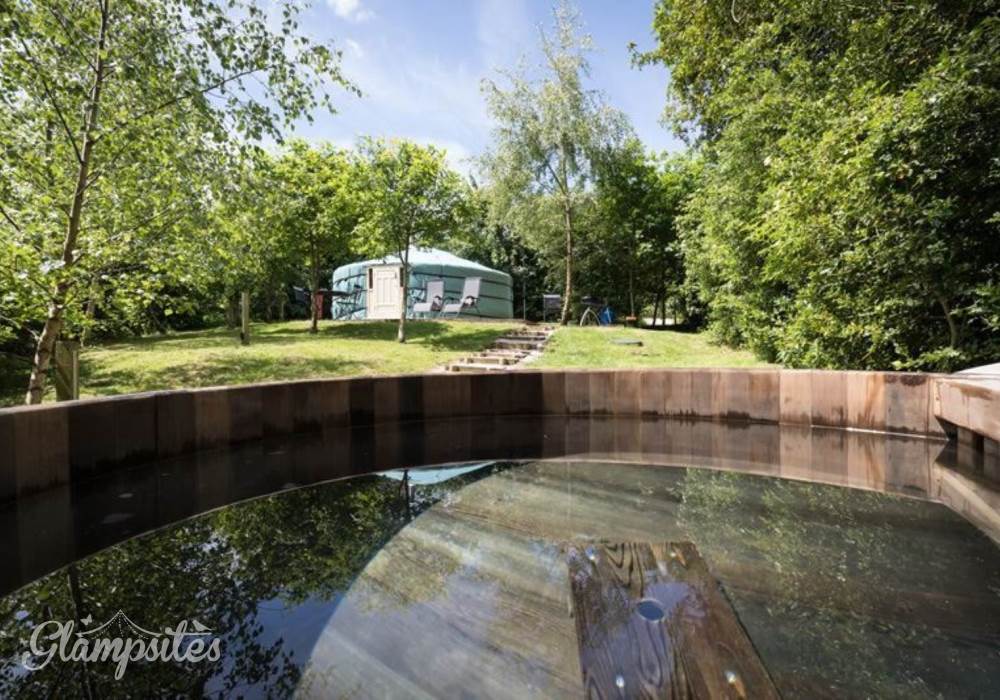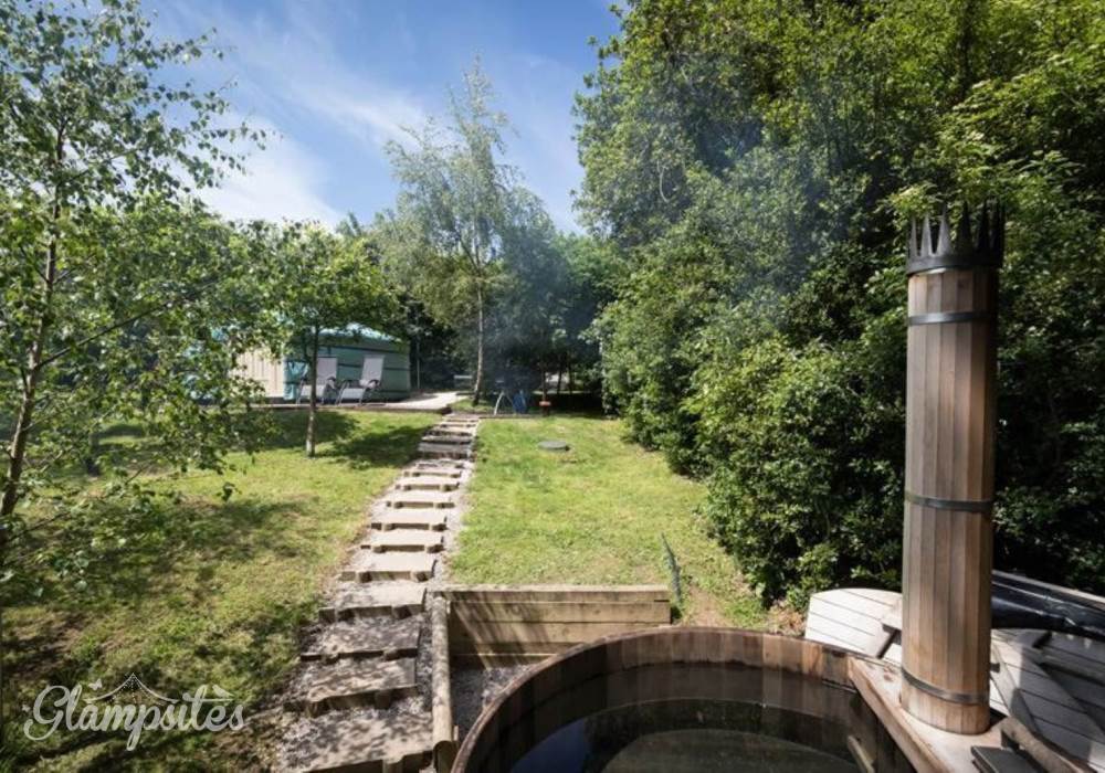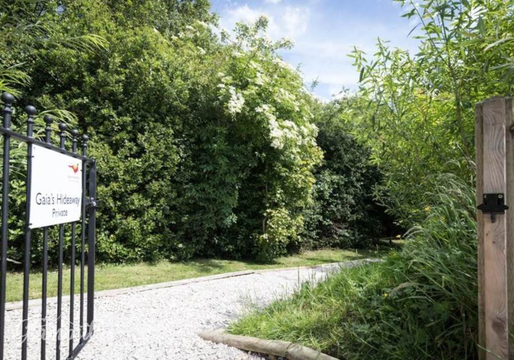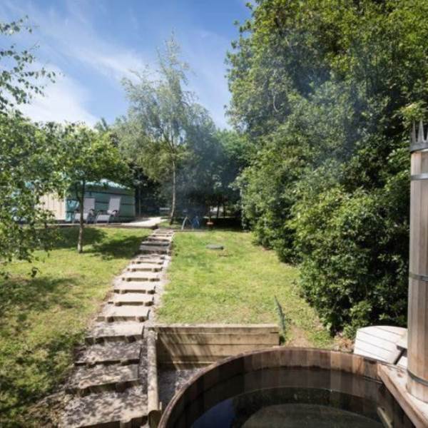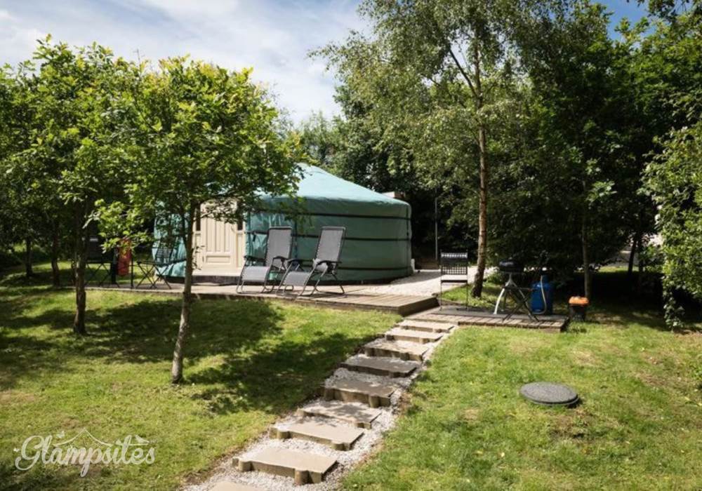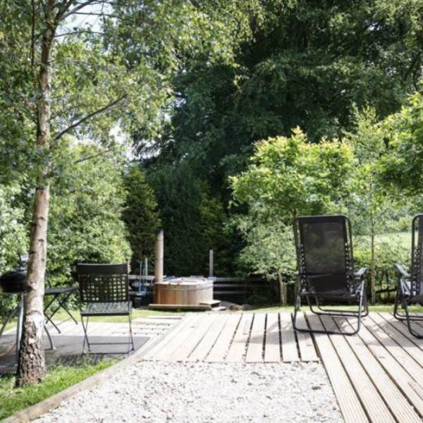 Gaia’s Hideaway is approached from a path at the South-East corner of Upper Hurst Farm Caravan and Camping site leading down to a secluded corner surrounded by trees, natural hedgerows and with open views to the Peak District hills.