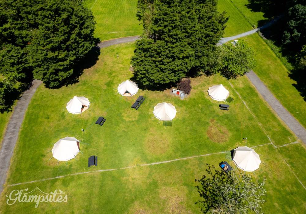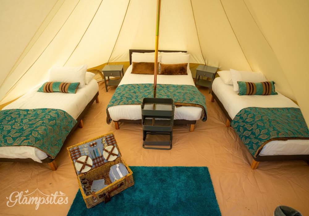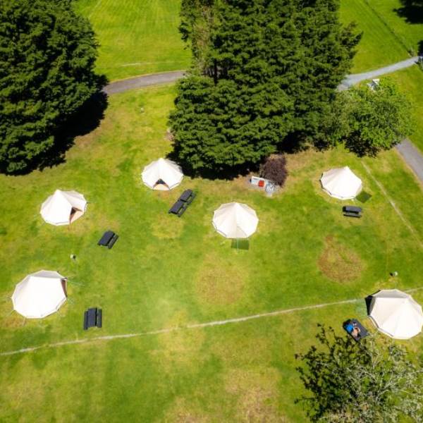 Relax in one of our 5-meter Bell Tents (sleeps 4) and look forward to hot shower access, free WiFi, electrical outlets, picnic benches, a football pitch and a recreation room.
