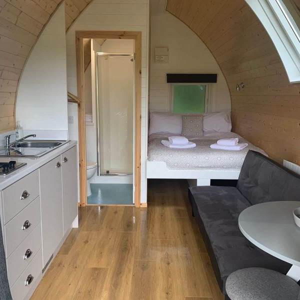 This pod is suitable for 2 adults or 2 adults with 2 children and includes full central heating, a private kitchen with fridge, microwave and toaster and a private ensuite bathroom with toilet and shower. This pod also welcomes up to 2 well-behaved pets to join guests (charges apply).