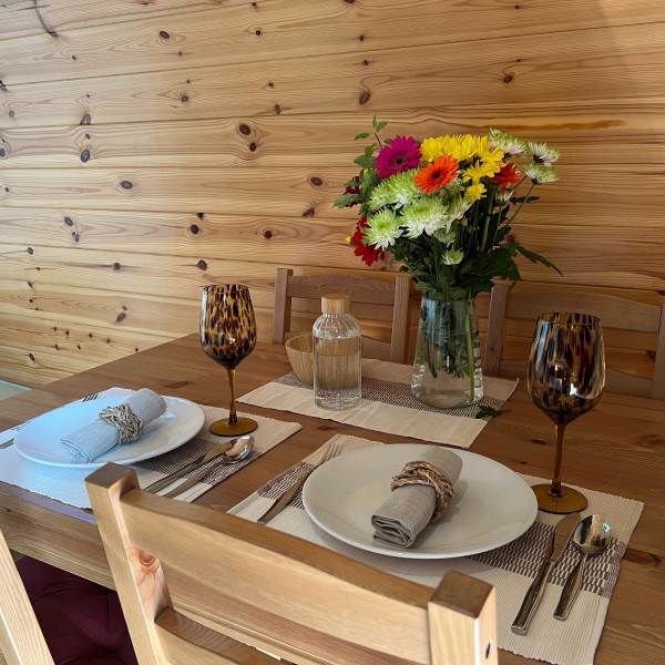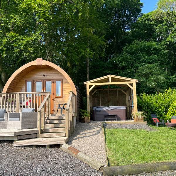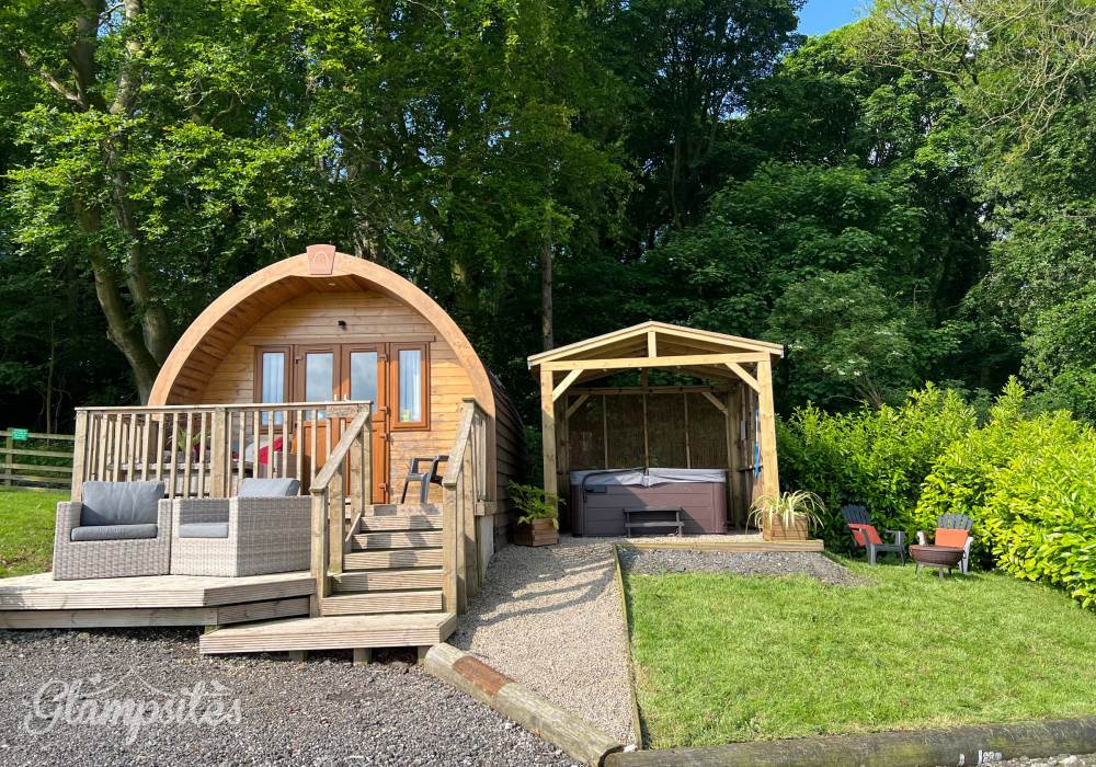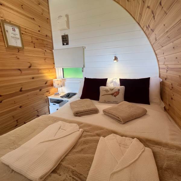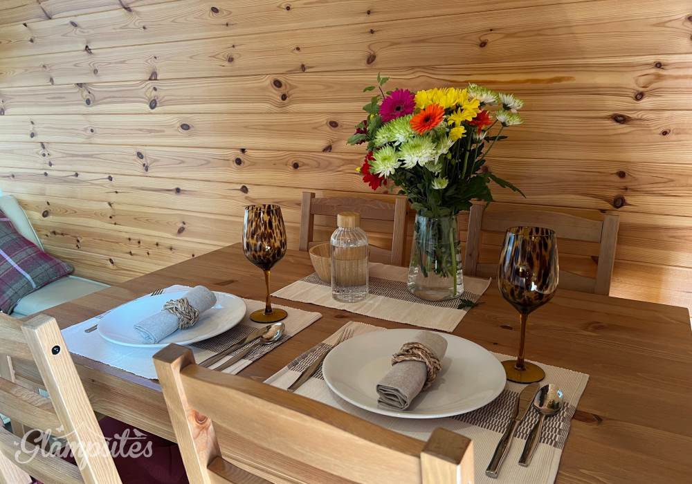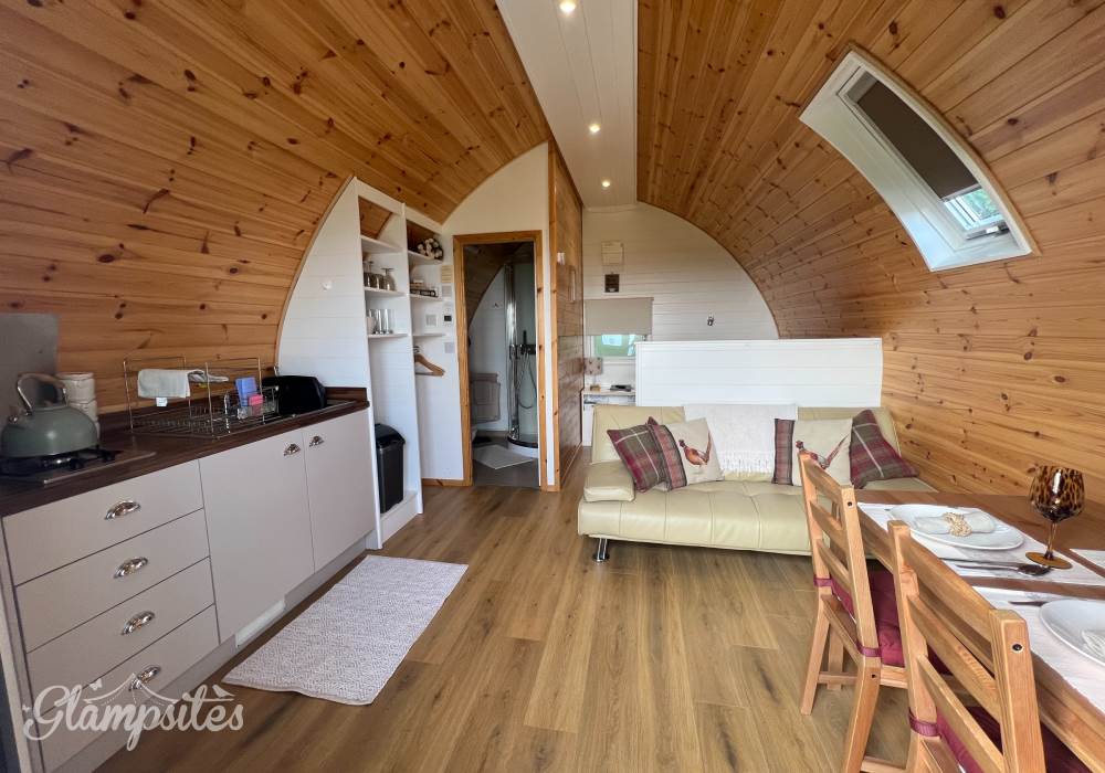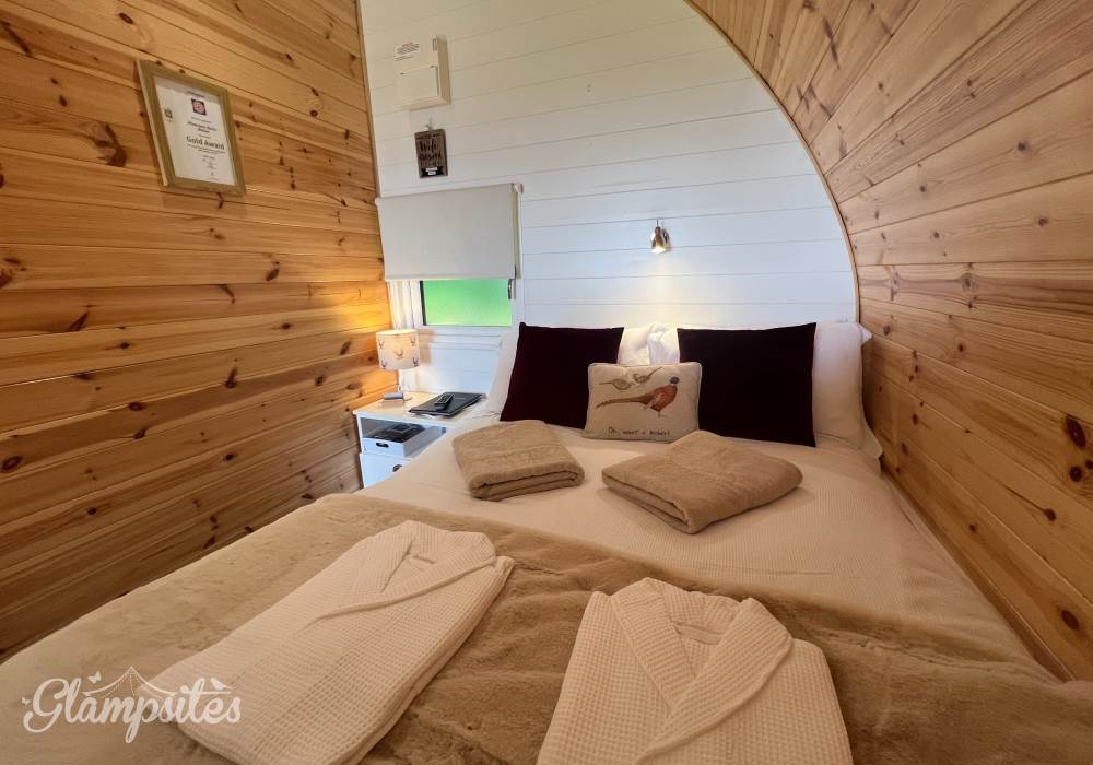 The glamping pod is well-appointed with modern amenities, including a bathroom, double bed, entrance security, Freeview TV, fully equipped kitchenette, hairdryer, hot tub, power sockets with USB points, and Wi-Fi access – all seamlessly integrated to cater to the needs and comforts of the guests. With its combination of stunning views and luxurious amenities, the Pheasants Roost Glamping Pod offers a memorable and indulgent escape in the heart of nature.