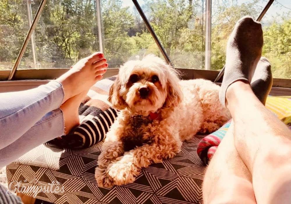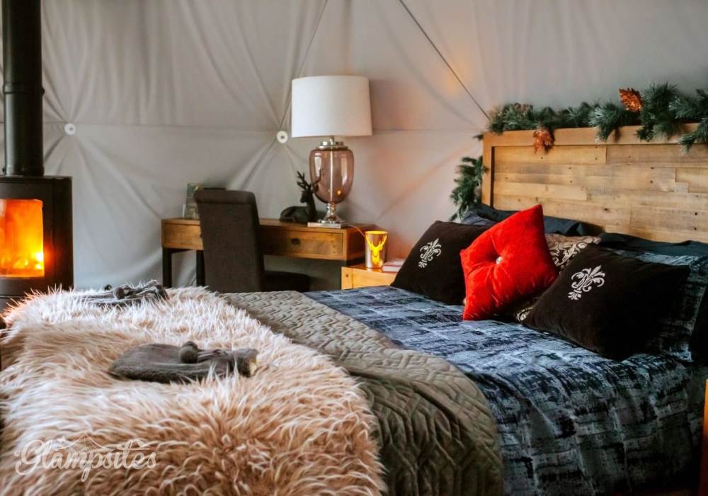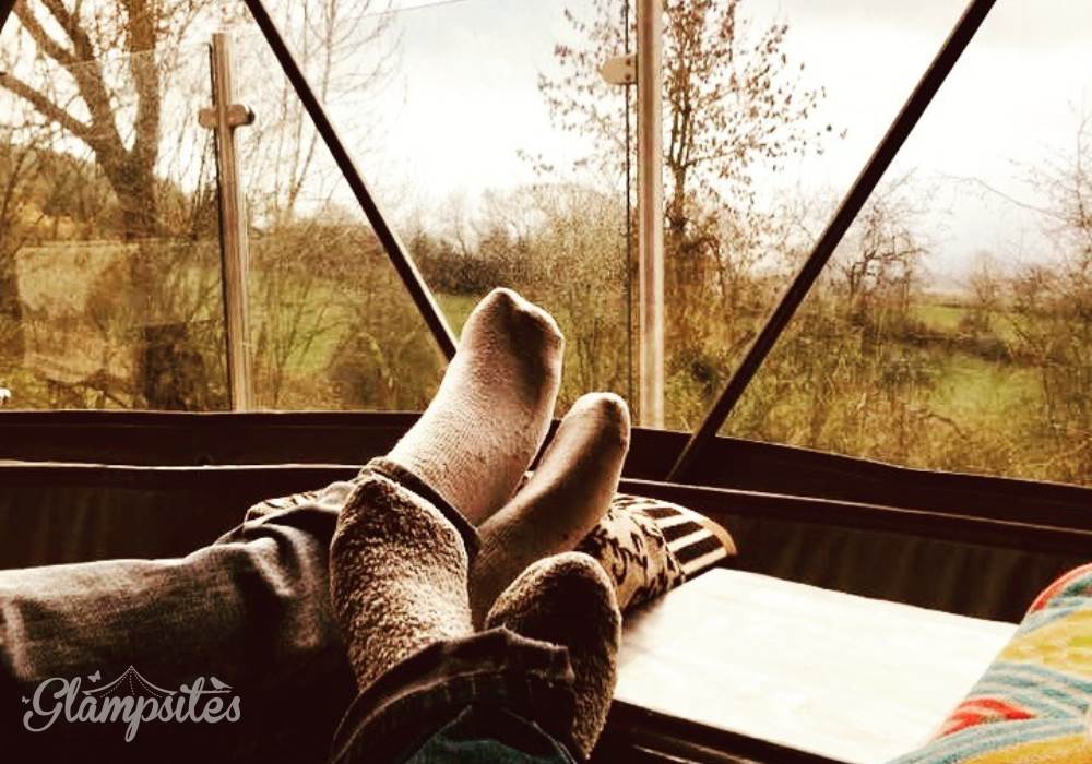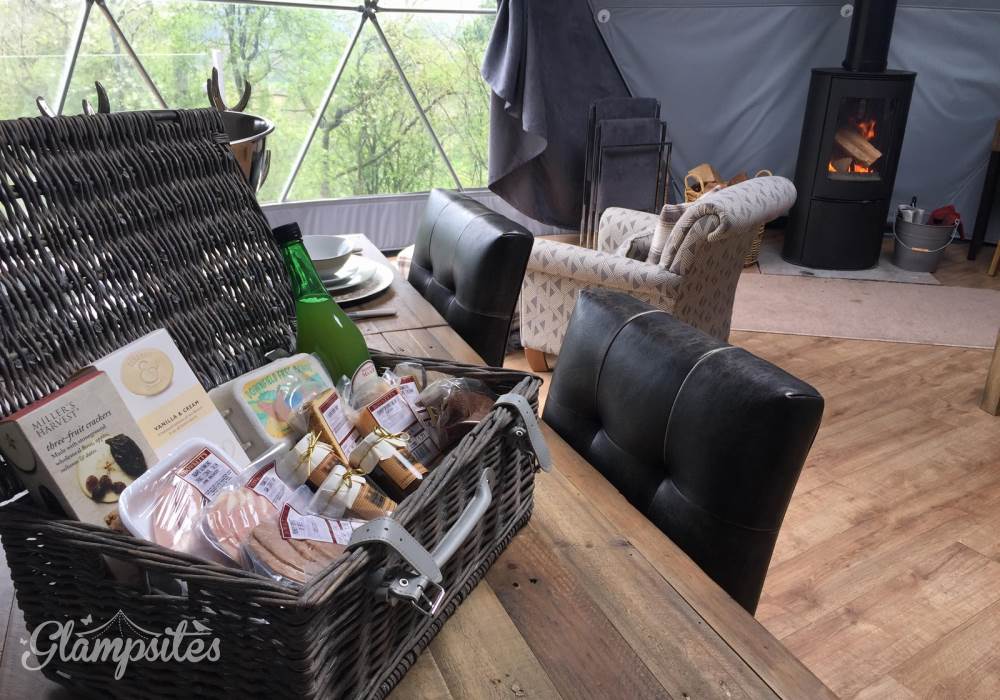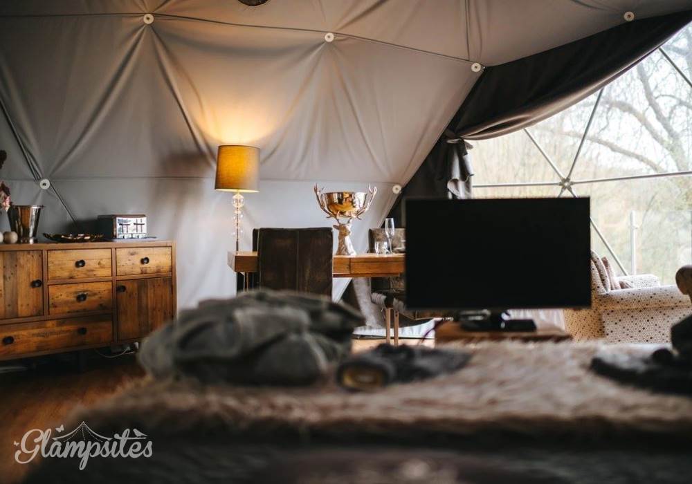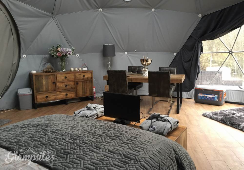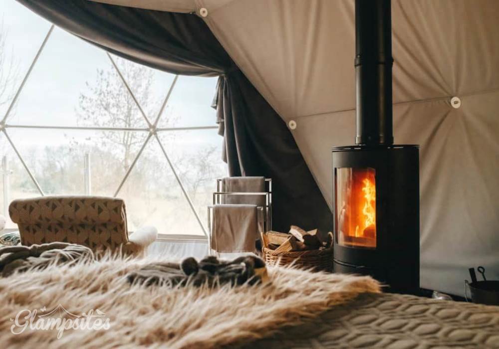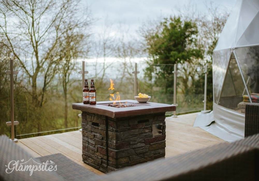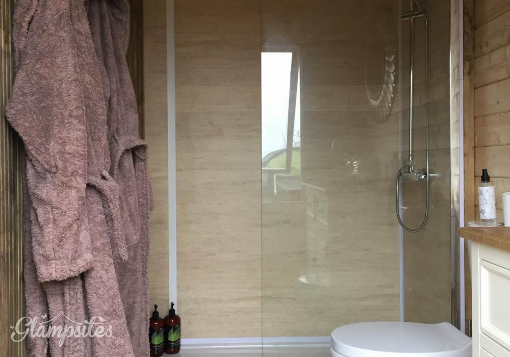 This luxurious glamping accommodation features a king size bed with plush pillows and a luxuriously cosy duvet, a full sized dining table and chairs, outside furniture, a luxurious Scandinavian wood fired hot tub (£65.00 extra charge payable direct), BBQ, and a private bathroom with a steaming hot shower, a flushing toilet and convenient kitchenette. All dogs are welcome at a £25.00 additional charge per dog, payable direct. All dogs must be declared before arrival.